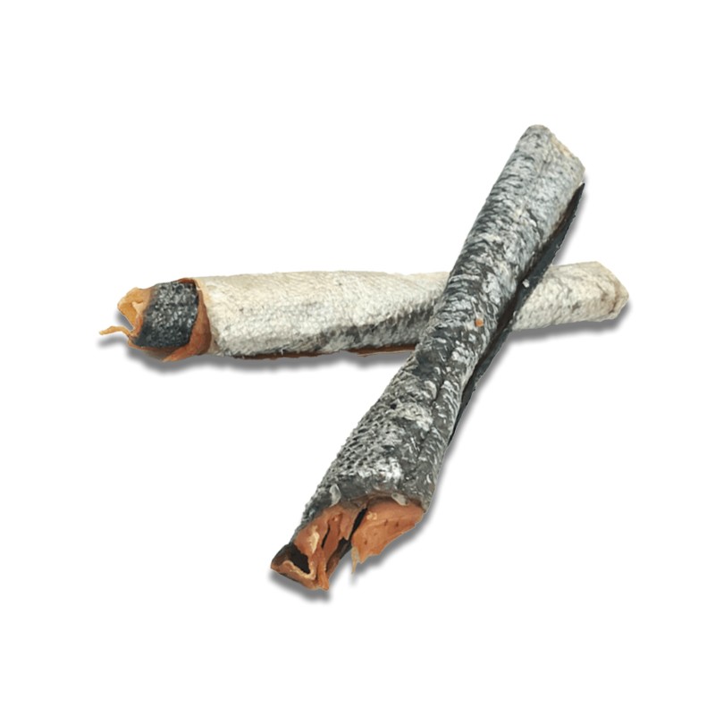 Délicieuse friandise de mastication, la Peau de Saumon avec chair est 100% naturelle et pauvre en matières grasses.